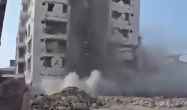 Kahramanmaraş merkezli depremlerde ağır hasar alan Hatay'da mahkeme süreci sona eren binaların yıkım ve enkaz kaldırma çalışmaları aralıksız sürüyor. İskenderun ilçesi Numune Mahallesi Dr. Sadık Ahmet Caddesinde bulunan 10 katlı apartman da iş makinesiyle kontrollü olarak yıkıldı. Binanın yerle bir olma anıysa kameralara yansıdı. 10 katlı binanın yıkımı esnasında herhangi bir olumsuzluk yaşanmadı. Problemsiz olarak gerçekleşen yıkılma anları ise saniye saniye cep telefonu kamerasına yansıdı.