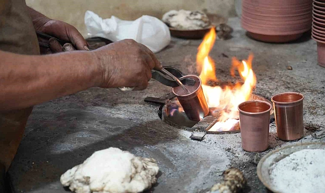 Gaziantep'te bakır ustaları, 100 dereceyi bulan ateş ocağında bakır kalaylamaya devam ediyor.