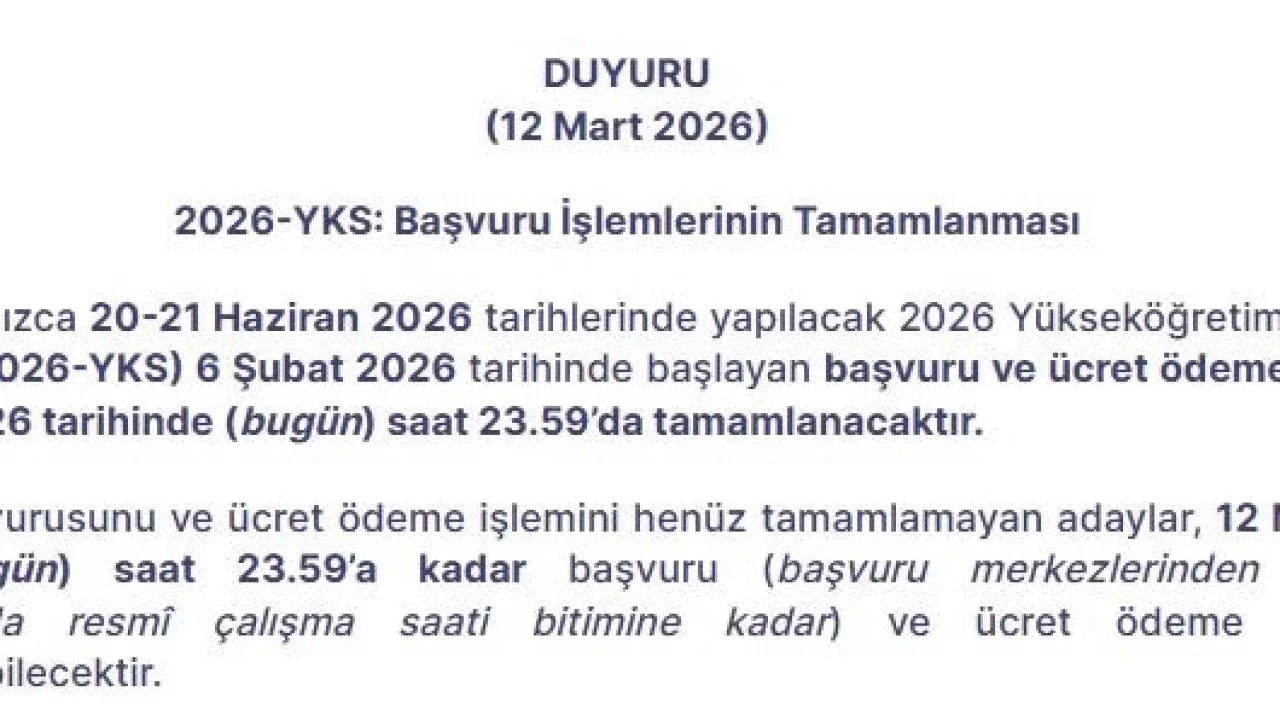Milli Eğitim Bakanlığı tarafından 20-21 Haziran tarihlerinde gerçekleştirilecek olan 2026 Yükseköğretim Kurumları Sınavı (YKS) için başvuru süreci bugün tamamlanıyor. 6 Şubat tarihinde başlayan başvuru ve sınav ücreti ödeme işlemleri, bugün saat 23.59 itibarıyla sona erecek.