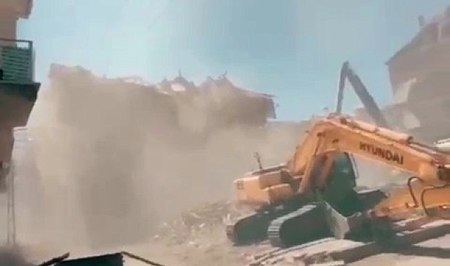 Elazığ'da 6 Şubat 2023'te Kahramanmaraş merkezli depremlerde ağır hasar gören binaların yıkımı devam ediyor. Merkez Yeni Mahalle'de ağır hasarlı 5 katlı binanın, çevre güvenliğinin alınmasının ardından yıkımına başlandı. Binanın yıkımı sırasında iş makinelerinin yanı sıra ses dalgalarından da faydalanıldı. Binanın yıkımına, belirli noktalarına korna sesiyle destek verildi. İş makinelerinin müdahalesi ve ses dalgalarının etkisiyle 5 katlı bina yıkıldı.