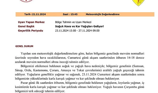 Bölgeyi etkilemesi beklenen soğuk ve yağışlı hava nedeniyle Samsun, Sinop, Ordu, Kastamonu, Çorum, Amasya ve Tokat illeri çevrelerinin aralıklı yağışlı geçeceği tahmin edildiğine dikkat çekilen açıklamada, "Yağışların genellikle yağmur ve sağanak, 23 Kasım 2024 Cumartesi günü akşam saatlerinden sonra bölgemizin yükseklerinde karla karışık yağmur ve kar şeklinde olması bekleniyor. Pazar günü ilk saatlerden itibaren, bölgemiz genelinde beklenen yağışların, kıyılarda yağmur, iç kesimlerde karla karışık yağmur ve kar şeklinde olması bekleniyor. Yağışlı havanın çarşamba günü bölgemizi terk edeceği tahmin ediliyor" denildi.