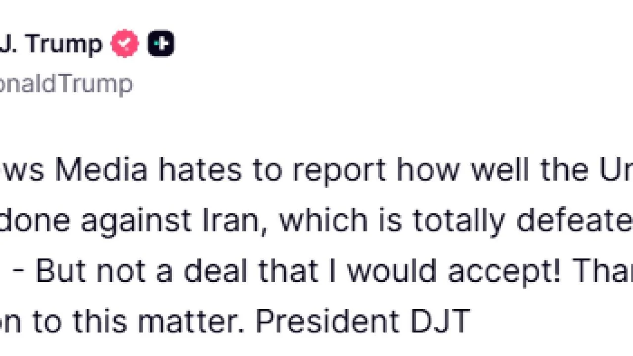 İHA'nın haberine göre Trump Truth sosyal medya platformu üzerinden yayınladığı mesajda ABD basınına sitem ederek yalan haber medyası ABD ordusunun tamamen yenilgiye uğrayan ve bir anlaşma yapmak isteyen İran karşısında ne kadar başarılı olduğunu haber yapmaktan nefret ediyor dedi. Başkan İranın istediğini iddia ettiği anlaşma teklifini kendi standartlarına uygun bulmadığını belirtti.