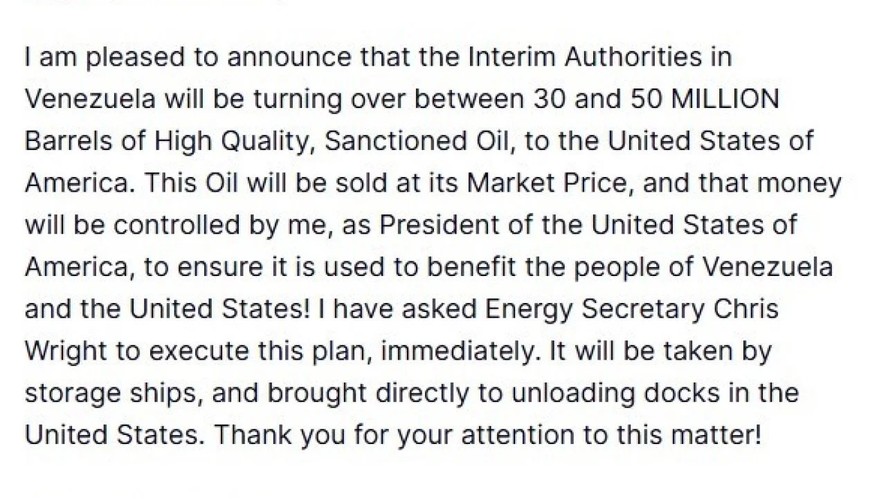 ABD Başkanı Donald Trump, Venezuela’daki geçici yönetimin yaptırım altındaki 30 ila 50 milyon varil arasında yüksel kaliteli petrolü ABD’ye devredeceğini açıkladı. Trump, piyasa fiyatından satılacak bu petrolden elde edilecek gelirin kendi kontrolünde olacağını söyledi.