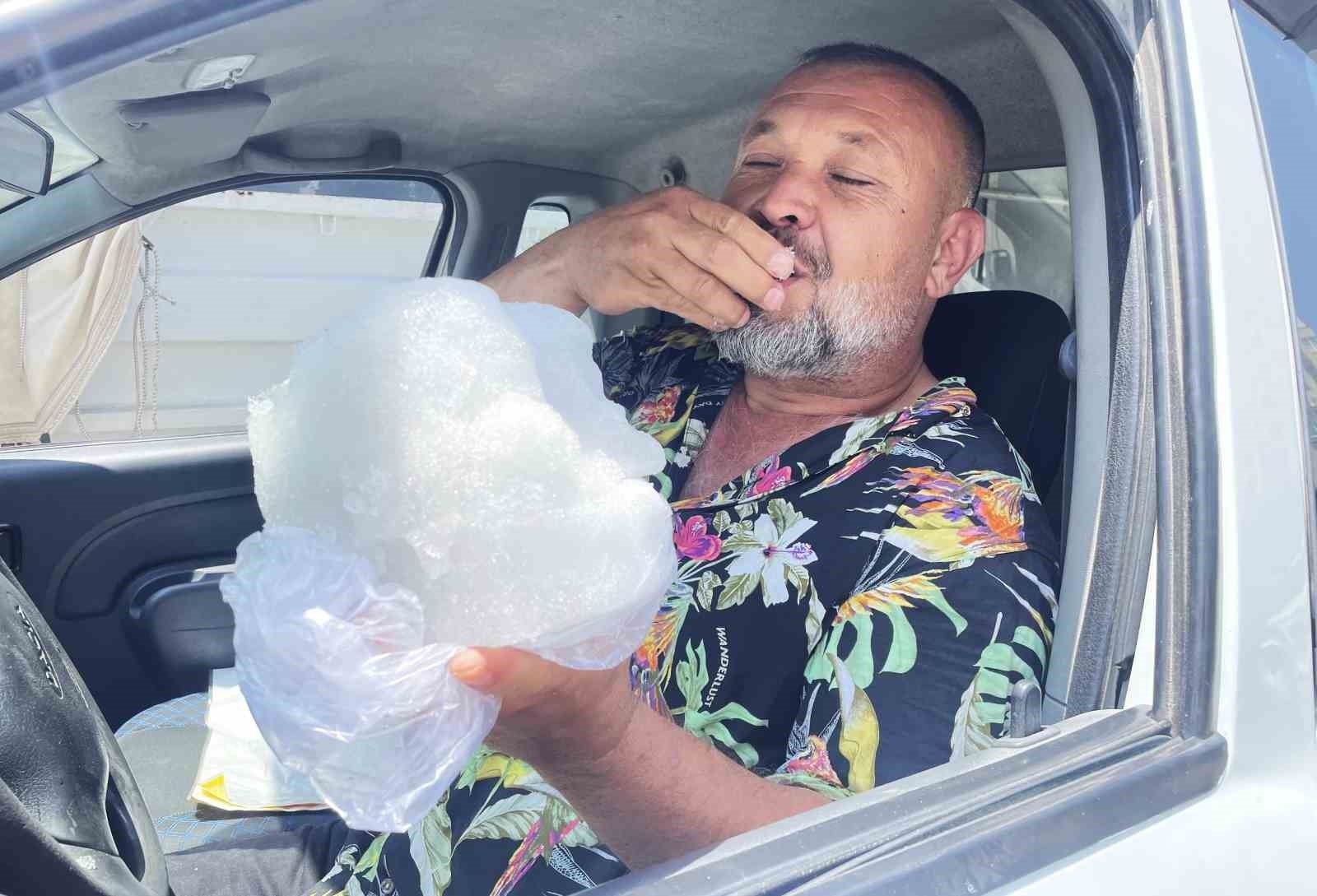 Adana'da vatandaşlar nem ile birlikte 50 derece hissedilen bunaltıcı sıcaklarda Toros Dağları'ndan getirilen kar ile serinliyor.