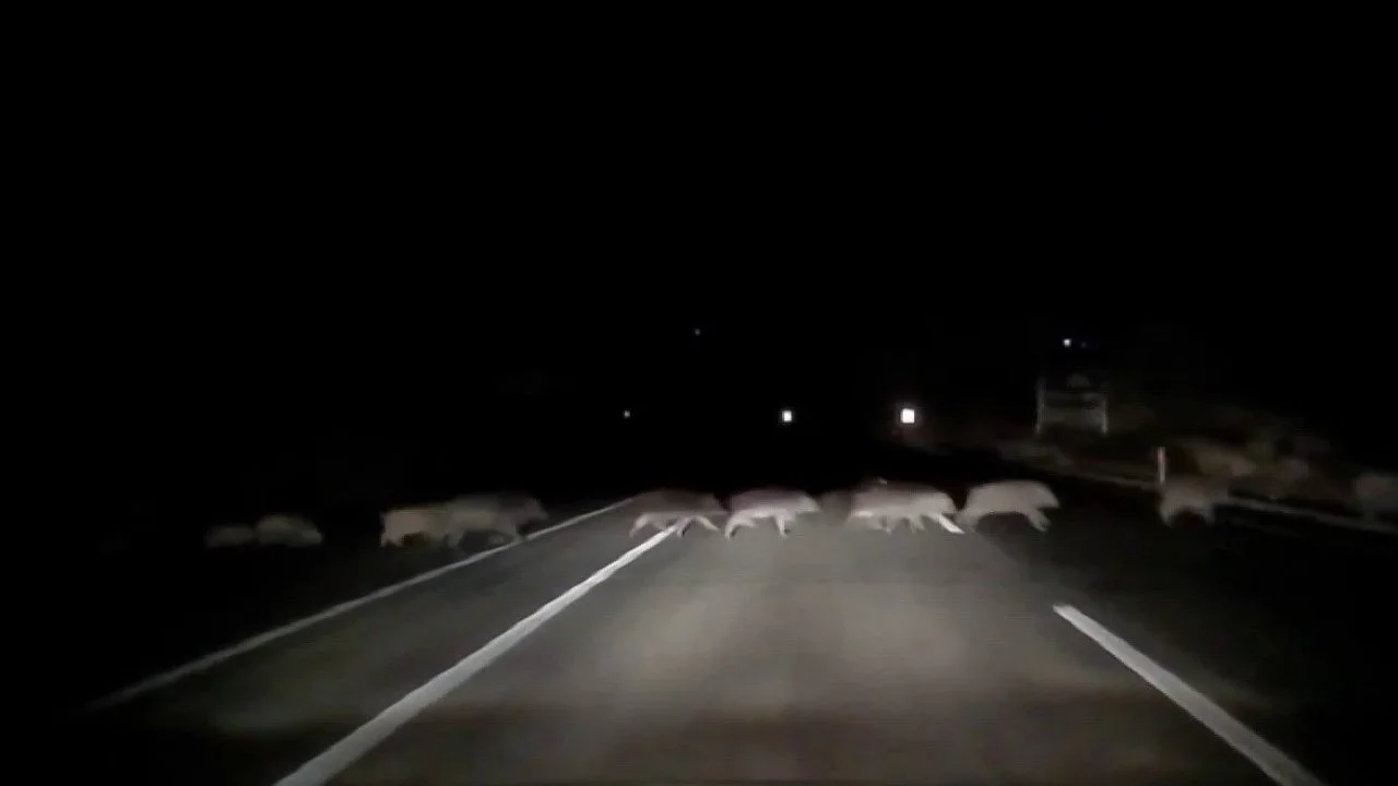Adıyaman-Gölbaşı karayolunda, Şambayat Beldesi yakınlarında gece saatlerinde yola aniden çıkan bir domuz sürüsü, tehlikeli anların yaşanmasına neden oldu.