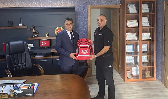 Iğdır AFAD İl Müdürü Deniz; Iğdır İl Özel İdaresi Genel Sekreteri Yüksel Kasım Çarman’ a Afet ve Acil Durum çantası takdim etti.