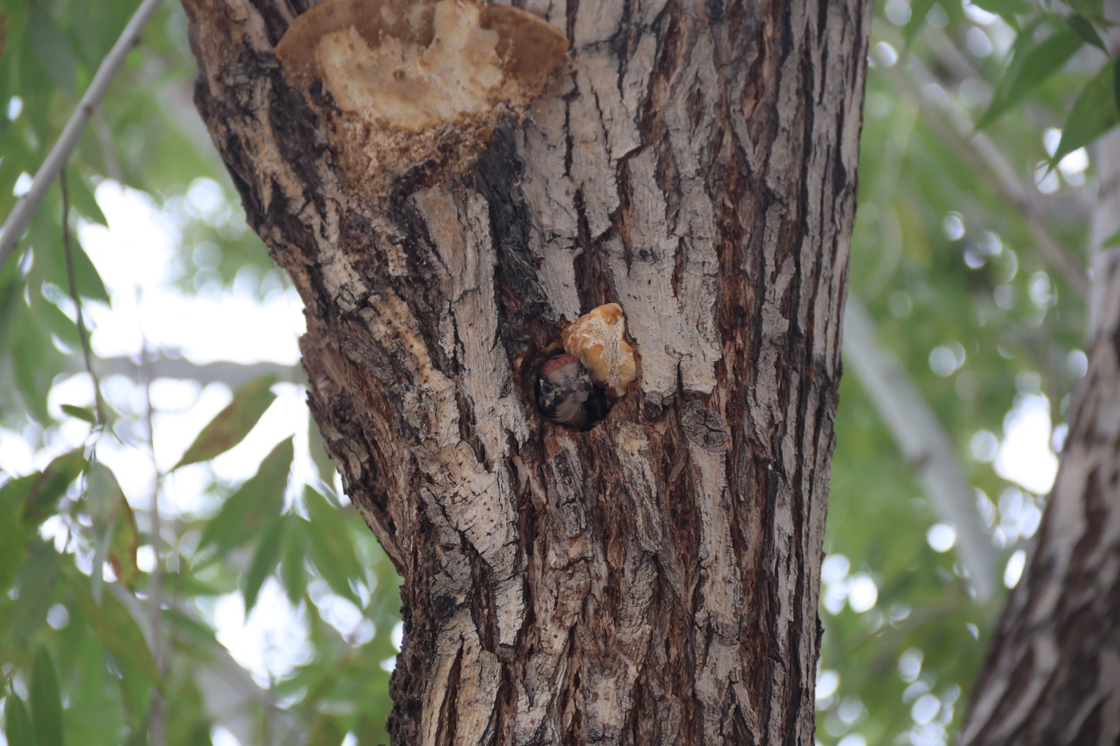 Iğdır İl Özel İdaresi bahçesinde ağacın kovuğuna yuva yapan yavru alaca ağaçkakan, çalışanların ve ziyaretçilerin ilgi odağı oldu.