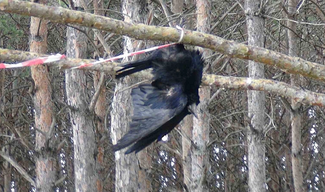 Hayvan otlatan vatandaşlar tarafından cep telefonu kamerasıyla kaydedilen görüntülerde, ağaçta ayaklarından asılı olarak telef olan karga yer alıyor.