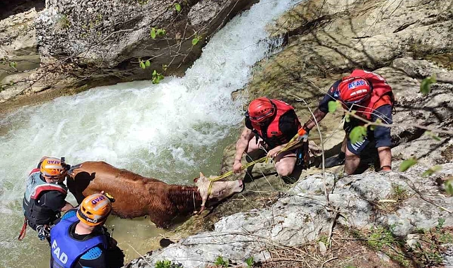 Kastamonu'nun Ağlı ilçesine bağlı Selmanlı Mahallesi'nde kayalıklardan dere yatağına yuvarlanan bir dana, AFAD (Afet ve Acil Durum Müdürlüğü) ekiplerinin başarılı çalışmasıyla kurtarıldı.
