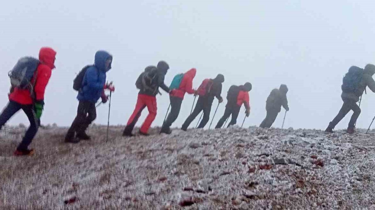 Eylül ayına rağmen zirvesinde kar, sis ve fırtınanın etkili olduğu Ağrı Dağı, yerel rehber Cuma Saltik öncülüğündeki bir grup dağcıya ev sahipliği yaptı.