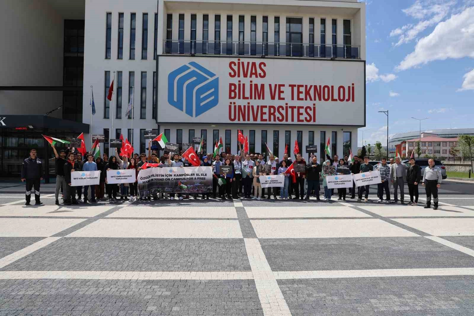 Sivas Bilim ve Teknoloji Üniversitesi'nde (SBTÜ) öğrenci ve akademisyenler İsrail'in Filistin'e uyguladığı zulüm protesto edildi. Akademisyen ve öğrencilerin katıldığı protestoda Filistin'e destek mesajları verildi.