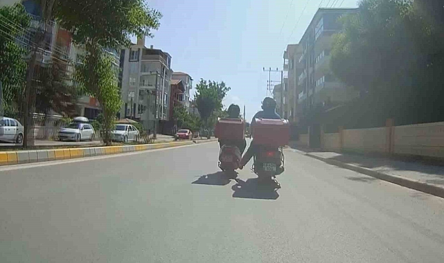 Aksaray'da motosikleti arızalanan kurye arkadaşına yardım etmek isteyen başka bir kurye, motosikleti ayağıyla iterek kilometrelerce trafikte seyretti. Bu tehlikeli yolculuk, başka bir motosikletin güvenlik kamerasına anbean yansıdı.