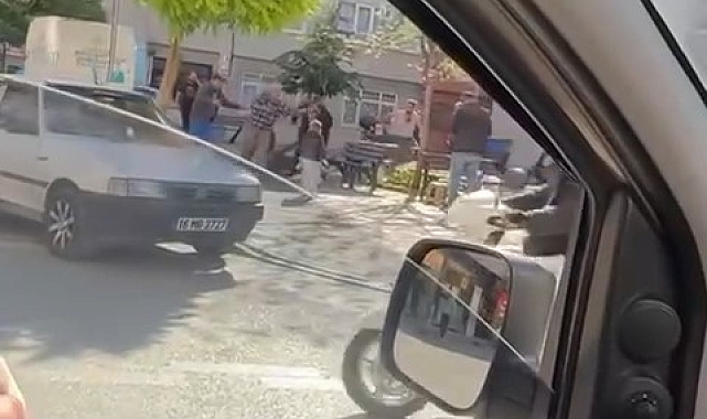 Olay, merkez Osmangazi ilçesi Fatih Mahallesi'nde meydana geldi. Edinilen bilgiye göre, aralarında daha önceden alacak-verecek meselesi yüzünden husumet bulunan 2 kişi yol üzerinde karşılaştı. Tartışma kısa sürede büyürken taraflar yanlarında çocuklarının olmasına aldırmadan kavgaya tutuştu. Kavga anı çevredekilerin araya girmesiyle son buldu. O anlar cep telefonu kamerasına yansıdı.