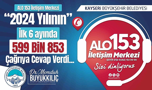 Kayseri Büyükşehir Belediyesi Basın Yayın ve Halkla İlişkiler Daire Başkanlığı bünyesinde hizmet veren Alo 153 Çağrı Merkezi; 2024 yılının ilk 6 ayında 599 bin 853 çağrıya cevap vererek vatandaşların talep ve şikâyetlerini anında değerlendirip işleme aldı.