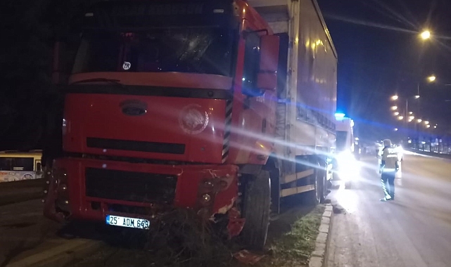 Edinilen bilgilere göre, Yunus Çelik (44) yönetimindeki 25 ADM 649 plakalı kamyon, Alparslan Türkeş Caddesi üzerinde seyir halindeyken direksiyon hakimiyetini kaybetti. Araç, önce orta refüje daha sonra da kaldırım üzerindeki bir ağaca çarparak durabildi.