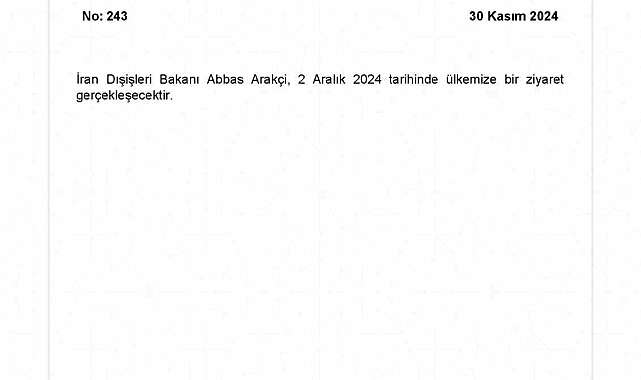 Dışişleri Bakanlığı'nın sosyal medya hesabından yapılan açıklamada, "İran Dışişleri Bakanı Abbas Arakçi, 2 Aralık 2024 tarihinde ülkemize ziyaret gerçekleştirecektir" denildi.