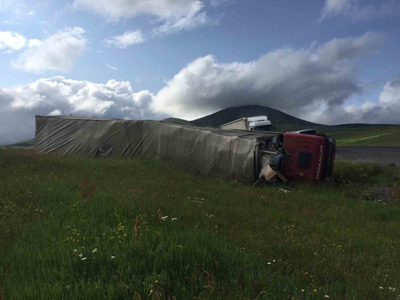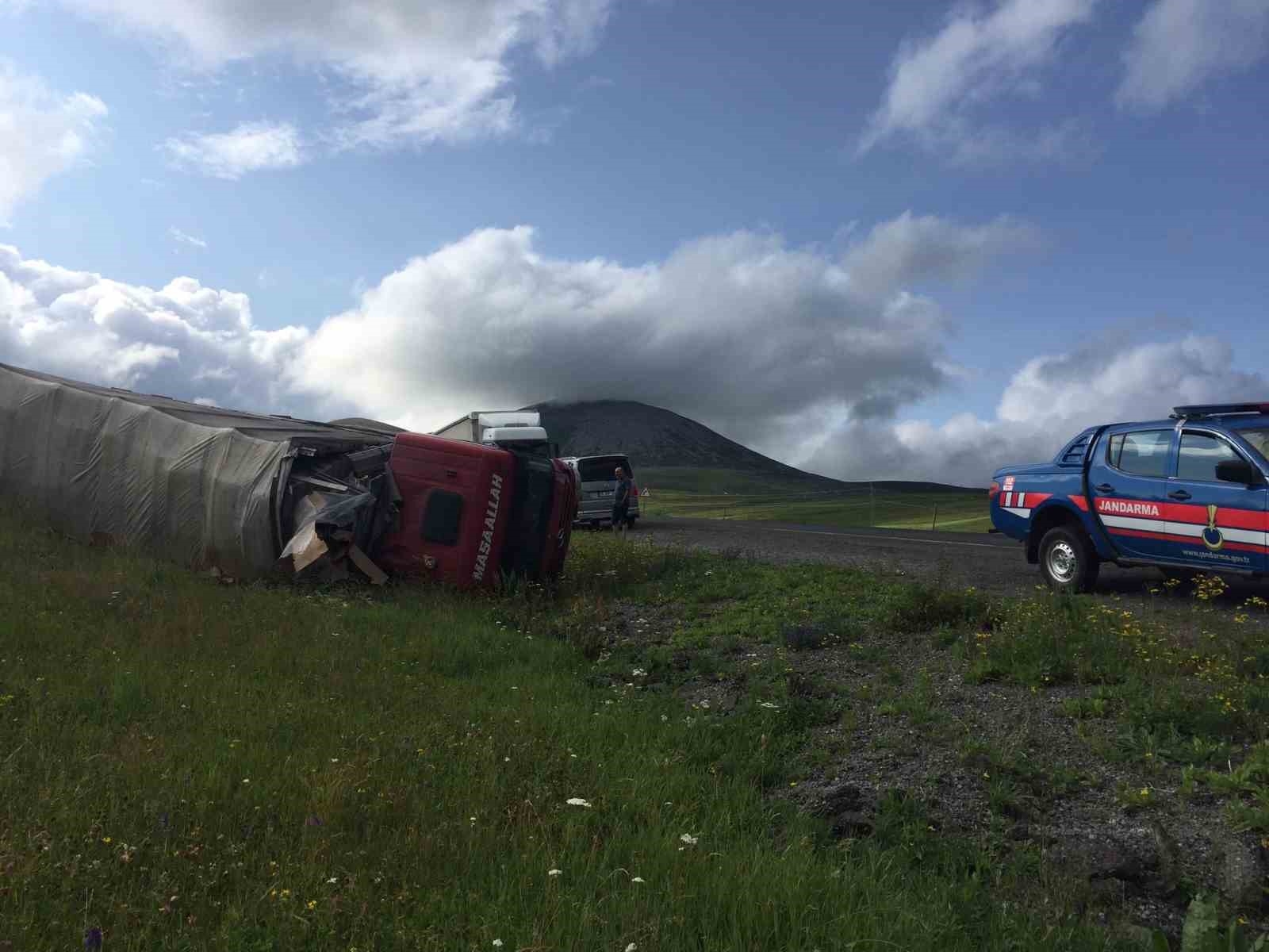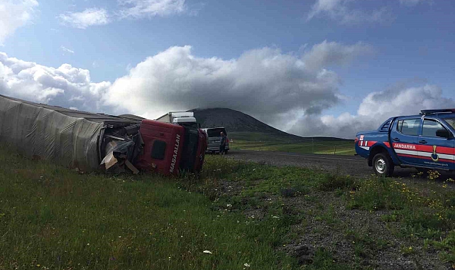 Ardahan'ın Posof ilçesinde sürücüsünün kontrolünden çıkan tır devrildi.