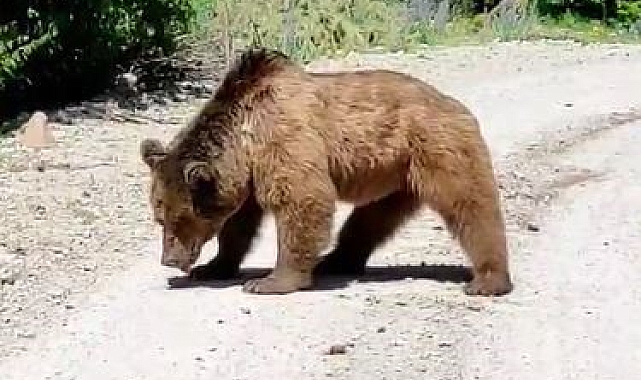 Sıcaktan bunaldığı gözlenen boz ayı bir süre sonra yoldan çıkarak ormanlık alan girdi ve gözden kayboldu