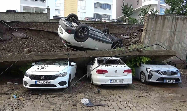 Samsun'un Atakum ilçesinde gece saatlerinde etkili olan şiddetli sağanak yağışın ardından çöken istinat duvarı, gündüz saatlerinde gün yüzüne çıkan zararıyla dikkat çekti. Çökme sonucu park halinde bulunan 4 araç kullanılamaz hale geldi.
