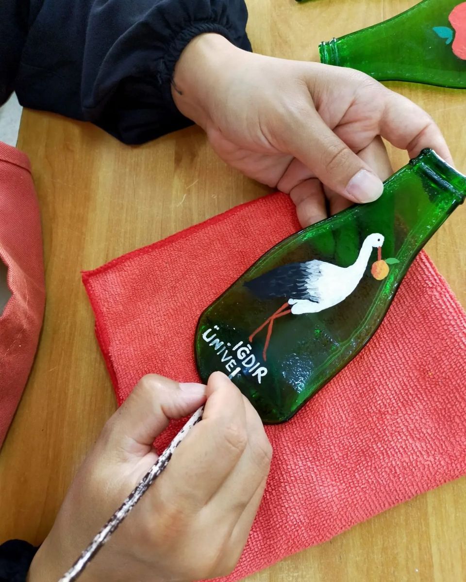 Iğdır Üniversitesi Cam ve Seramik Atölyesi’nde atık soda şişelerinden Iğdır’a özgü leylek, kayısı ve elma sembollerinin bulunduğu hediyelik eşyalar üretiliyor.