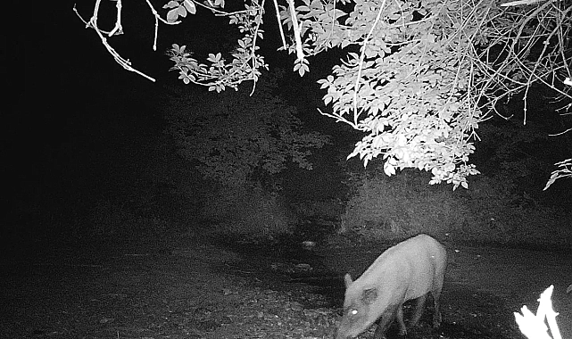 Bilecik'te bir akarsudan su içen ayı ve domuz fotokapana yakalandı.