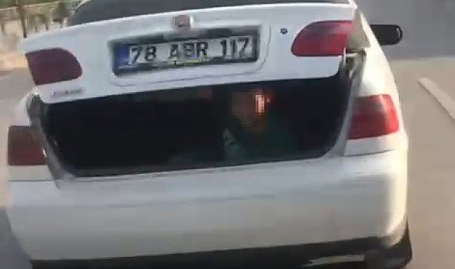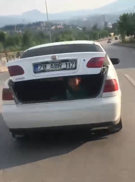Karabük'te küçük bir çocuğun otomobil bagajında tehlikeli yolculuğu cep telefonuyla görüntülendi.