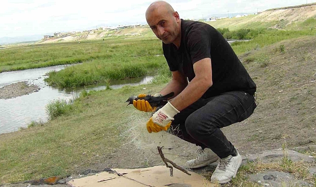 Kars'ta akarsu kenarına bırakılan tırıvırıya takılan yavru karga vatandaşlar tarafından kurtarılarak doğaya bırakıldı.