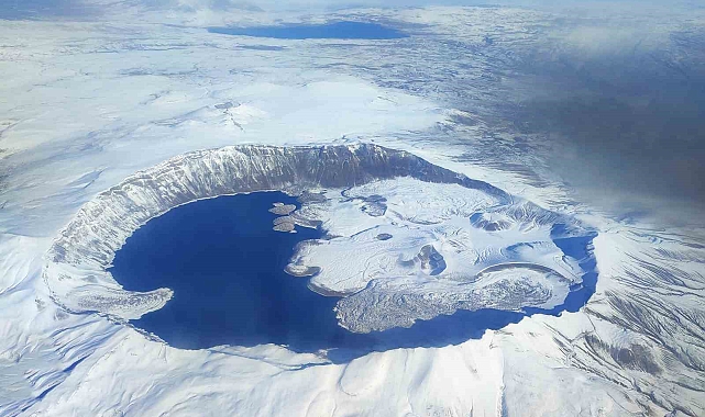 Bitlis'in Ahlat, Güroymak ve Tatvan ilçe sınırları içinde bulunan Nemrut Dağı'nda yer alan krater gölü, karla kaplanan etkileyici görüntüsüyle yolcu uçağından yolcular tarafından görüntülendi. Avrupalı Seçkin Destinasyonlar (EDEN) projesi kapsamında 'Mükemmeliyet Ödülü' sahibi olan 2 bin 250 rakımlı Nemrut Krater Gölü, İstanbul-Van seferini yapan yolcu uçağında seyahat eden yolcular tarafından gökyüzünden görüntülendi. Adem Gül isimli yolcu tarafından cep telefonu ile uçaktan çekilen görüntülerde kar yağışı sonrası mavi ve beyazın buluştuğu Nemrut Krateri muhteşem manzarasıyla dikkat çekti. Kayda alınan görüntüde, Nemrut Krateri'nin yanı sıra Ahlat ilçesinde bulunan Nazik Gölü ile Adilcevaz ilçesinde bulunan Aygır Gölü ile Süphan Dağı ve Erek Dağı'da aynı kadrajda yer aldı.