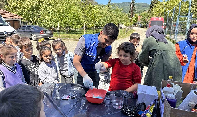 Düzce Gençlik ve Spor Müdürlüğü bilim karavanı timi Cumayeri ilçesi Ören Şehit Nusret Akar ilkokulu öğrencilerle birlikte deneyler yaptılar.