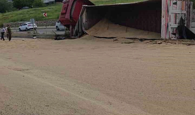 Olay, Ilıcalar beldesinde meydana geldi. Sürücüsünün henüz belirlenemeyen bir nedenle direksiyon hakimiyetini kaybettiği tır, yan yatarak devrildi. Tırın dorsesinde bulunan buğdayların yola savrulması, bölgede trafikte aksaklıklara neden oldu.