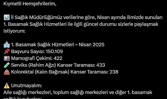 Bingöl Valisi Dr. Hamdi Usta'nın paylaştığı İl Sağlık Müdürlüğü verilerine göre, Nisan ayında 1. Basamak Sağlık Hizmetlerine toplam 150 bin 109 başvuru yapıldı. Bu başvurular içerisinde bin 93 kişiye yönelik kanser taraması gerçekleştirildi.