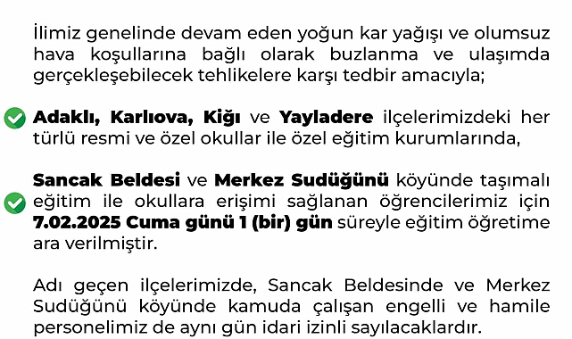 Bingöl Valiliği, yoğun kar yağışı ve olumsuz hava koşulları nedeniyle Adaklı, Karlıova, Kiğı ve Yayladere ilçelerinde eğitime 7 Şubat 2025 tarihinde 1 gün ara verildiğini duyurdu.
