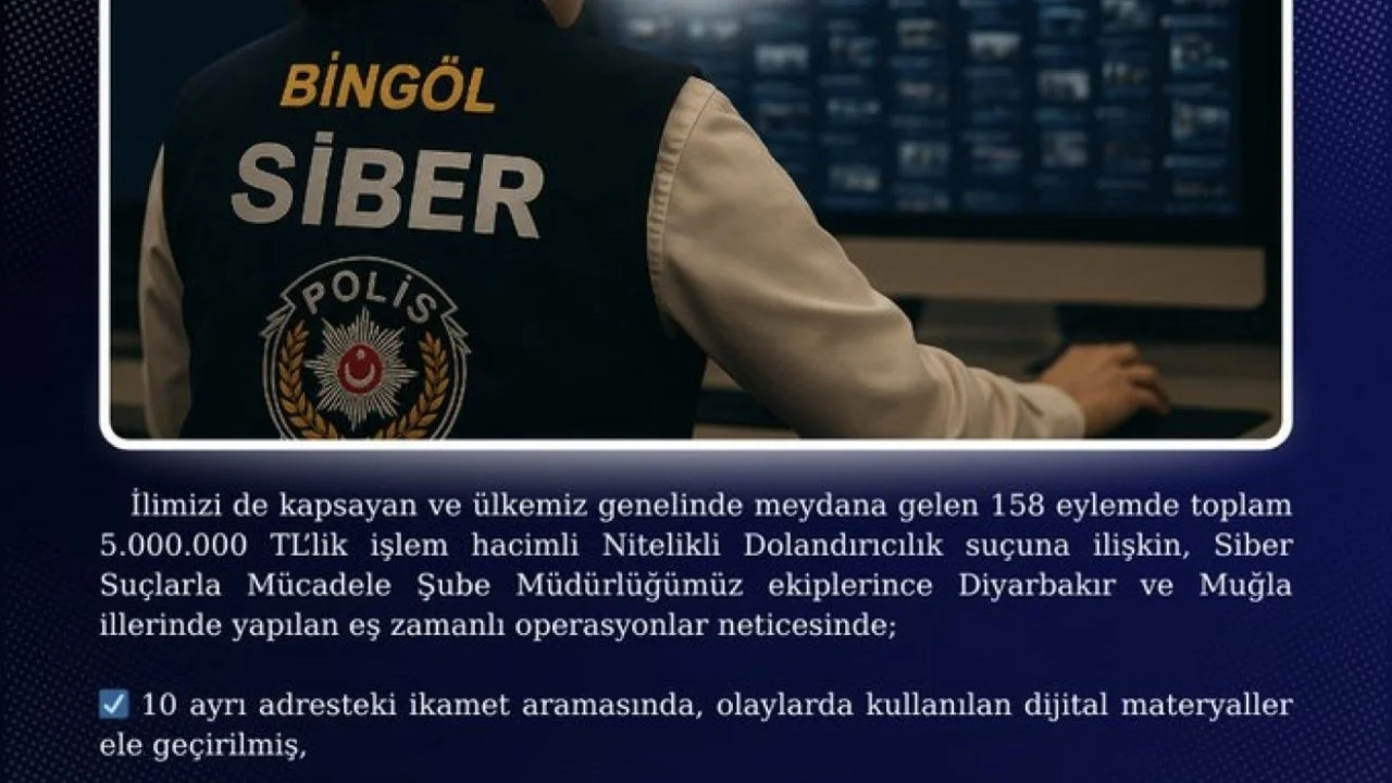 Bingöl İl Emniyet Müdürlüğü, ülke genelinde meydana gelen 158 eylemde toplam 5 milyon TL’lik işlem hacimli "nitelikli dolandırıcılık" suçuna ilişkin çalışma yaptı. Siber Suçlarla Mücadele Şube Müdürlüğü ekiplerince Diyarbakır ve Muğla illerinde yapılan eş zamanlı operasyonlar neticesinde; 10 ayrı adreste operasyon düzenlendi. Operasyonda 9 şüpheli gözaltına alındı. Bingöl’e getirilen şüphelilerden 4’ü savcılık tarafından biri ise adli kontrol kararı ile serbest bırakıldı. 4 şüpheli ise tutuklanarak cezaevine gönderildi.