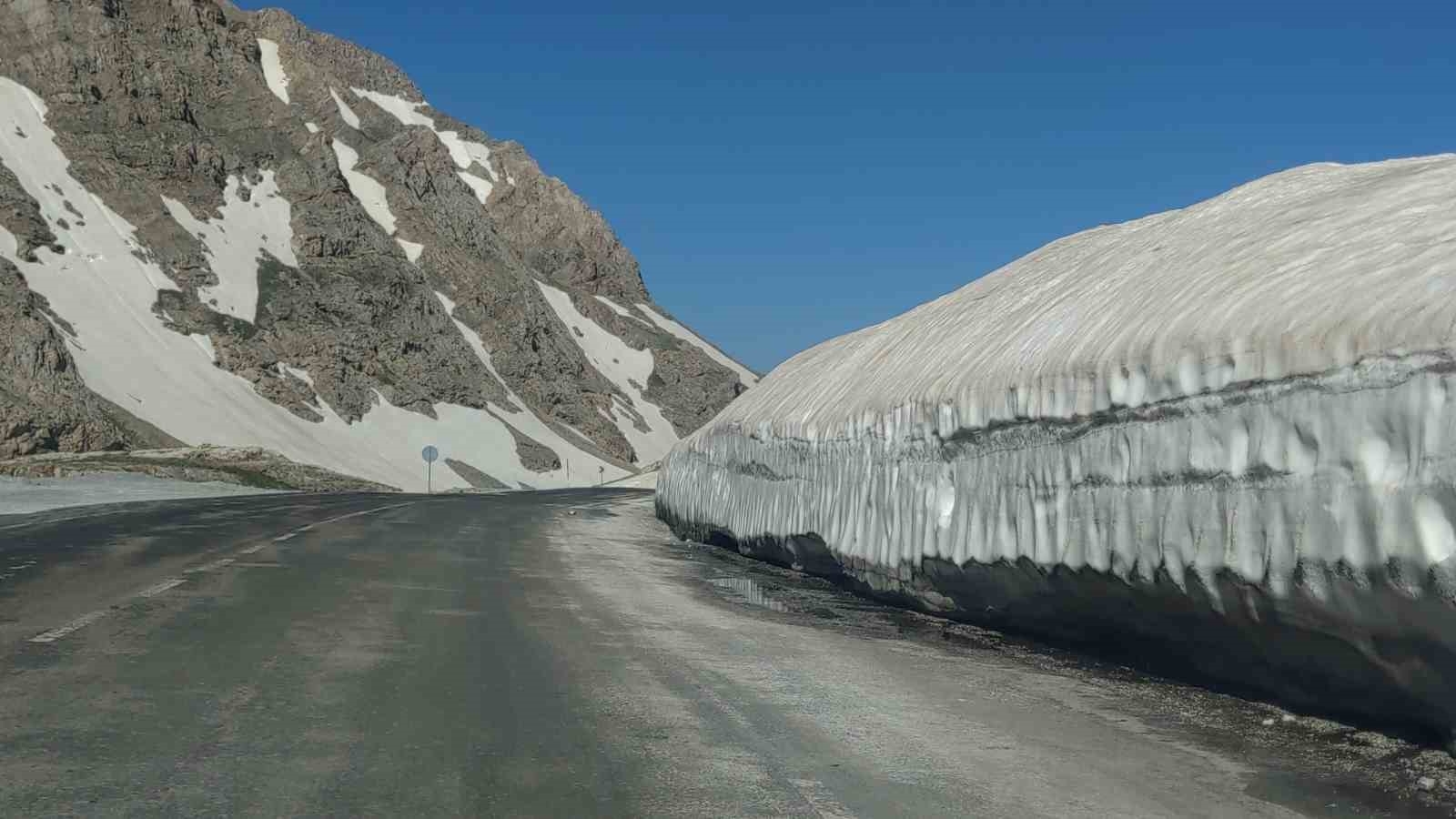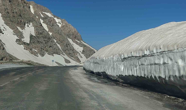 Van'da yaz mevsimi kendini iyiden iyiye hissettirirken, Van-Bahçesaray karayolu üzerindeki 3 bin rakımlı Karabet Geçidi'nde ise insan boyunu aşan kar kütleleri kış manzarası oluşturuyor.
