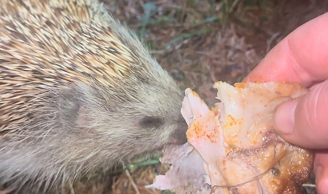 Bolu'da doğasever bir vatandaş yanına gelen kirpiyi kızarmış tavukla besledi. Kirpinin tavuk yediği anların görüntüleri sosyal medyada ilgi gördü.