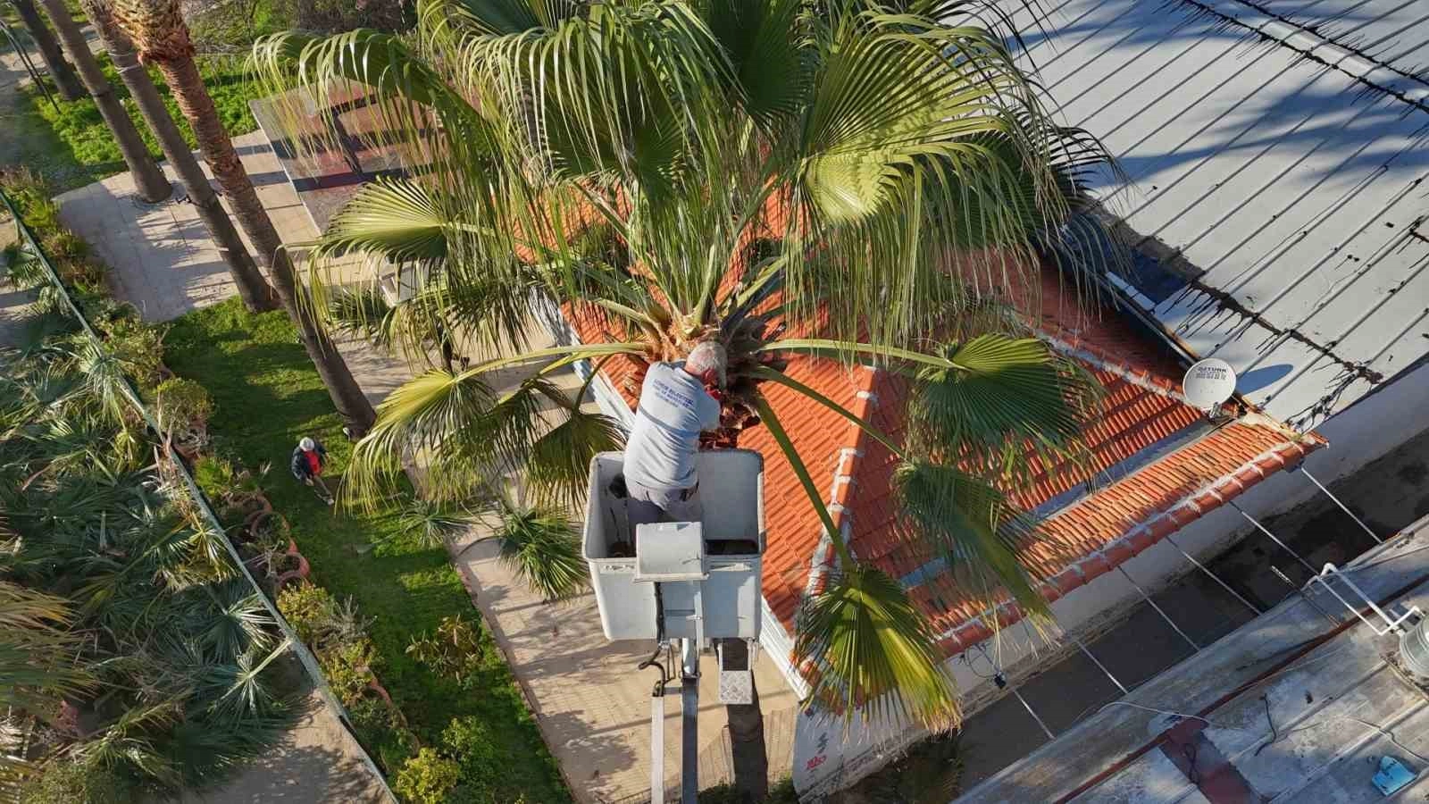 Belediye ekipleri, uygun hava şartlarının oluşmasıyla birlikte palmiye ağaçlarında budama çalışmalarına başladı.