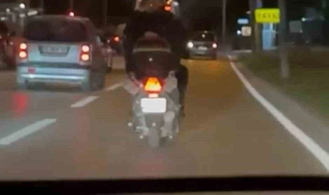 Olay, Yiğitler Mahallesi'nde meydana geldi. Ters yönde ilerleyen motosiklet sürücüsü, bir süre sonra arkasına bir yolcu aldı. Ancak tehlike bununla da sınırlı kalmadı. Motosiklet sürücüsü, yolcuyu da kendi gibi ters yöne bakacak şekilde motosiklete bindirdi.