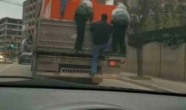 Bursa'nın Osmangazi ilçesinde meydana gelen olayda, üç genç, kamyonun arkasına tutunarak hayatlarını tehlikeye attı. O anlar, bir vatandaşın kamerasına saniye saniye yansıdı.