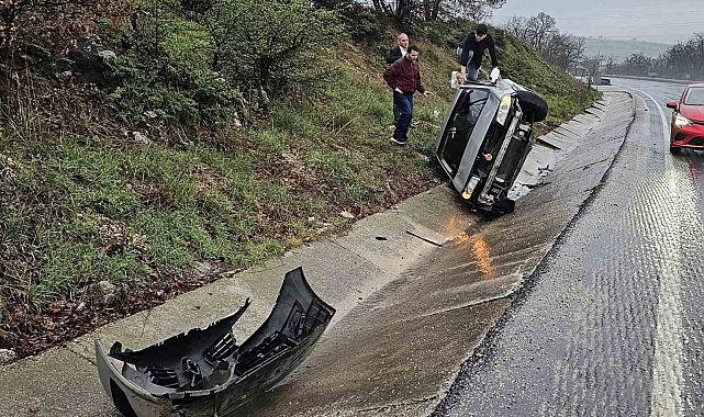 Bursa'nın İnegöl ilçesinde, yağışlı hava nedeniyle kontrolden çıkan bir otomobilin su kanalına devrilmesi sonucu meydana gelen kazada 2 kişi yaralandı.