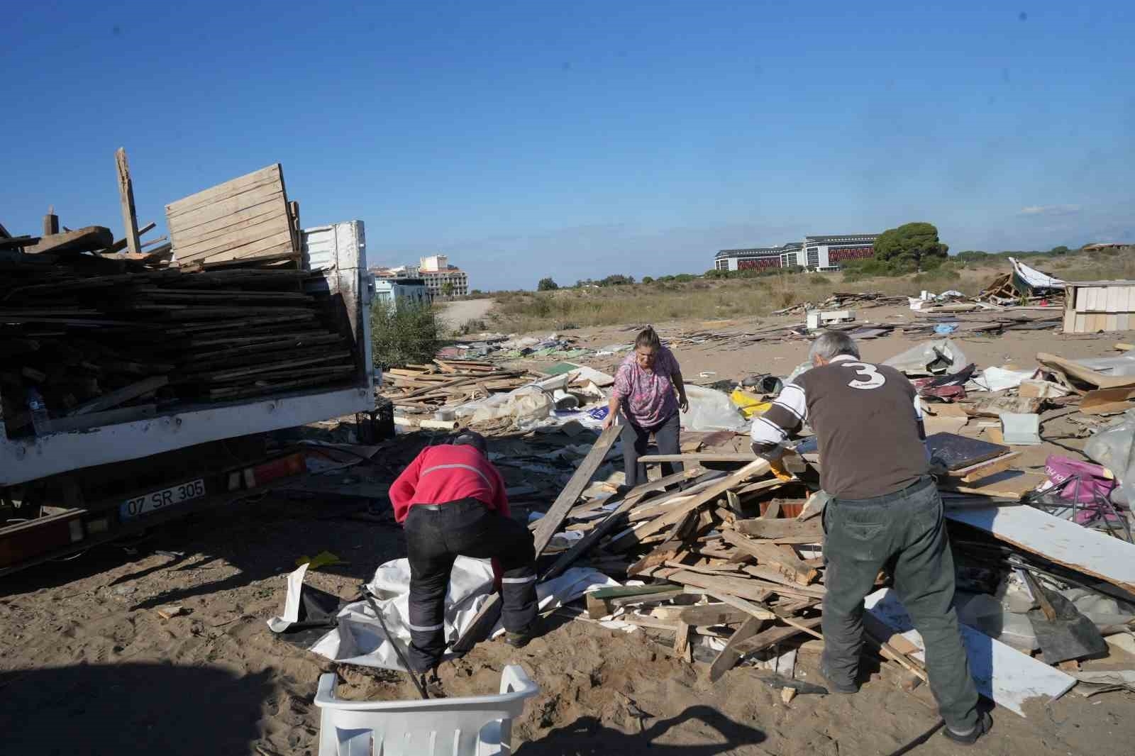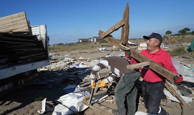 Antalya'nın Kumköy sahilinde doğal sit alanı içerisinde yer alan 700'e yakın çardak, Aksu Belediyesi tarafından gerçekleştirilen operasyonla yıkıldı. Çardaklardan geriye kalan malzemeleri bölge sakinleri toplarken, hurdacılar da bu materyalleri satın almak için harekete geçti.