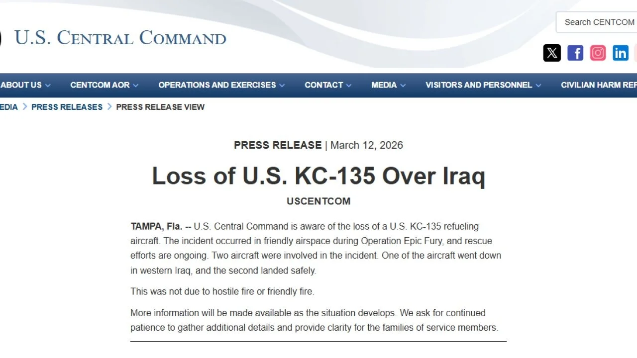 ABD Merkez Komutanlığı CENTCOM yaptığı açıklamada bir KC 135 tipi yakıt ikmal uçağının Irak hava sahasında düştüğünü doğruladı. Olayın Epic Fury Operasyonu sırasında meydana geldiği belirtildi.