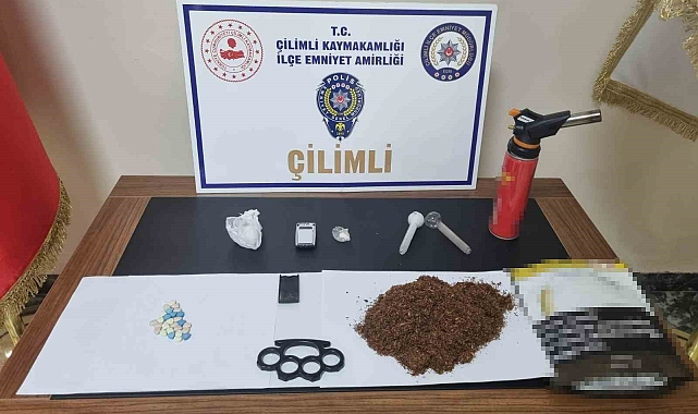 Çilimli İlçe Emniyet Müdürlüğü ekipleri yaptıkları çalışmalarda durumundan şüphelendikleri bir aracı durdurdular. Durdurulan araç içerinde yapılan aramada 27 adet ekstacy (sentetik ecza), 10.28 gram netamfetamin, 42 gram A/M, 2 adet cam payp, 1 adet anahtarlık görünümlü hassas terazi, 1 adet muşta ve 106 garm üzerine A/M sıkılmış kanobonoid maddesi ele geçirildi.