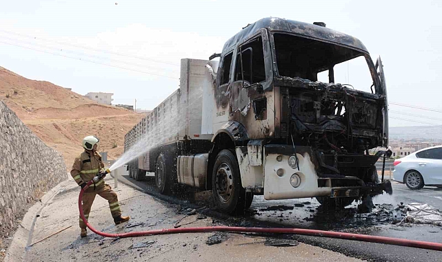 Şırnak'ın Cizre ilçesinde seyir halindeki bir tır, aniden alev alarak kullanılamaz hale geldi. İtfaiye ekiplerinin müdahalesiyle söndürülen yangından tırdan geriye demir yığını kaldı.