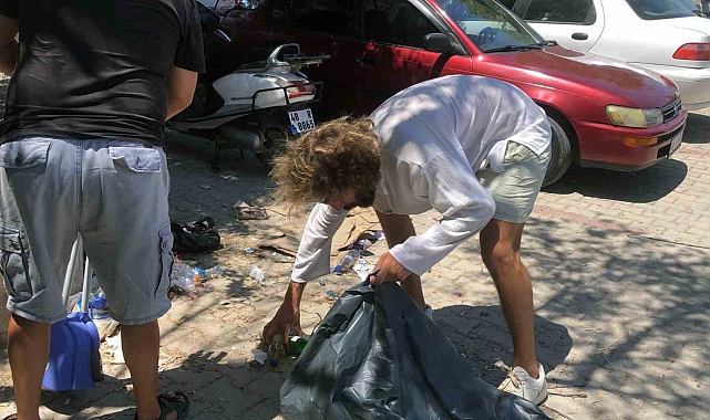 Muğla'nın önemli turistik ilçelerinden birisi olan Datça'nın İskele Mahallesinde uzun süredir toplanmayan çöpleri gören mahalle muhtarı eline poşeti alarak çöpleri topladı.