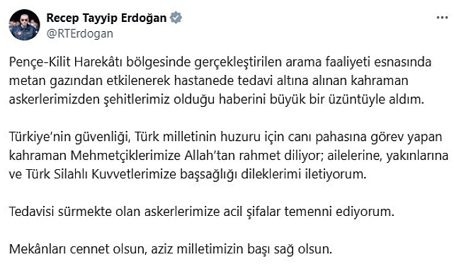 Cumhurbaşkanı Recep Tayyip Erdoğan, Pençe-Kilit Harekatı bölgesinde metan gazından etkilenerek şehit olan 5 asker için taziye mesajı yayımladı.