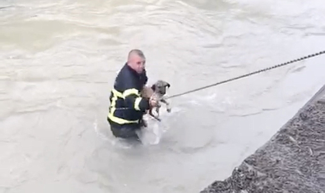 Olay, Cide ilçesinde meydana geldi. Edinilen bilgiye göre, ilçeden geçen dereye bir köpeğin düştüğünü ve suya düşmek üzere olduğunu gören vatandaşlar durumu itfaiyeye bildirdi. İhbar üzerine olay yerine gelen itfaiye ekibi köpeği kurtarmak için çalışma başlattı. Dereye merdivenle inen bir itfaiye eri, suyun karşısına geçerek köpeği bulunduğu yerden aldı. İtfaiye eri, köpeği kucağına alarak sudan geçirdi. Sağlık durumunun iyi olduğu belirlenen köpek yaşam ortamına salındı.