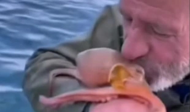 Didim'in Akköy Mahallesi Taşburun'dan denize açılan Birol Çinçik, ağlarını serdikten bir süre sonra kontrol ettiğinde bir ahtapotun takıldığını fark etti. Ağı özenle temizleyerek ahtapotu kurtaran Çinçik, denize geri bırakmadan önce ilginç bir davranış sergiledi. Ahtapotu eline alarak bir süre seven ve öpen duyarlı balıkçı, ardından nazikçe denize bıraktı.