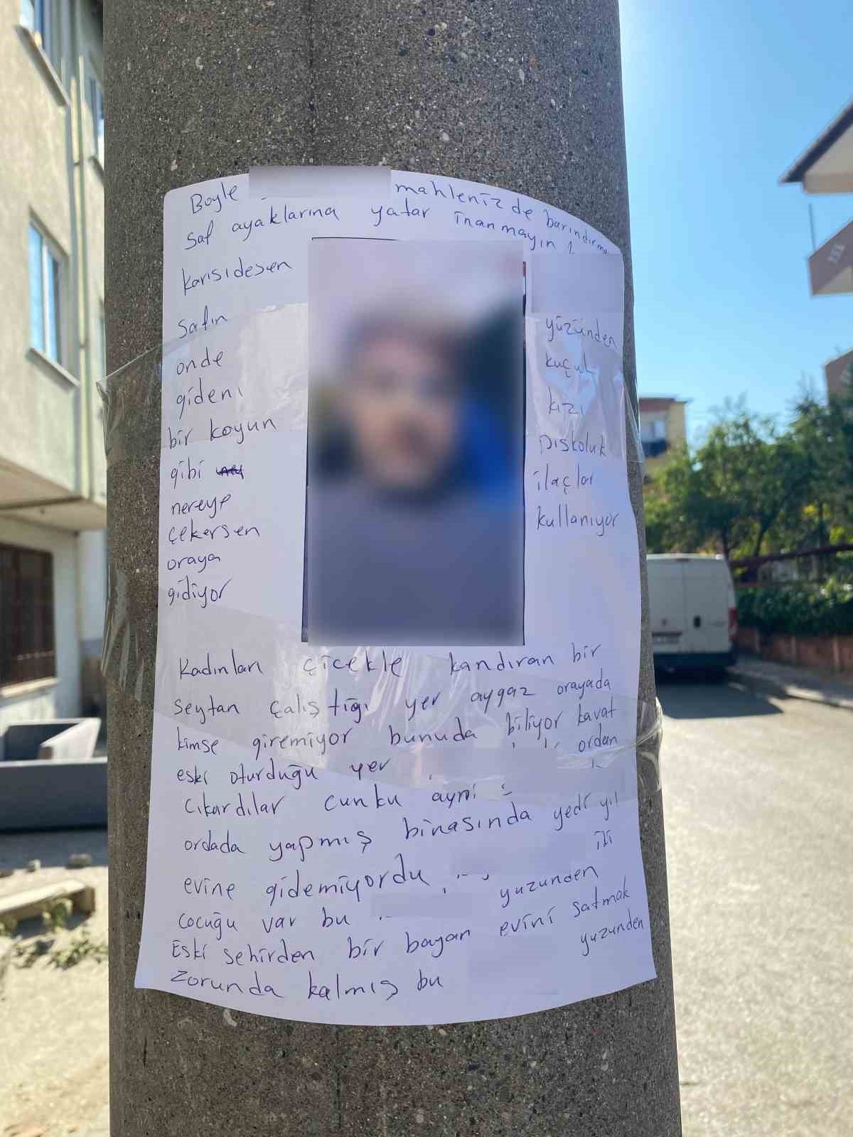 Kocaeli'nin Körfez ilçesinde direklere asılan taciz suçlamalarıyla dolu yazılar mahalleliyi şaşırttı. Üzerinde bir kişinin fotoğrafı ve suçlayıcı ifadeler bulunan afişlerin kim tarafından asıldığı bilinmezken, olay mahallede büyük merak uyandırdı.