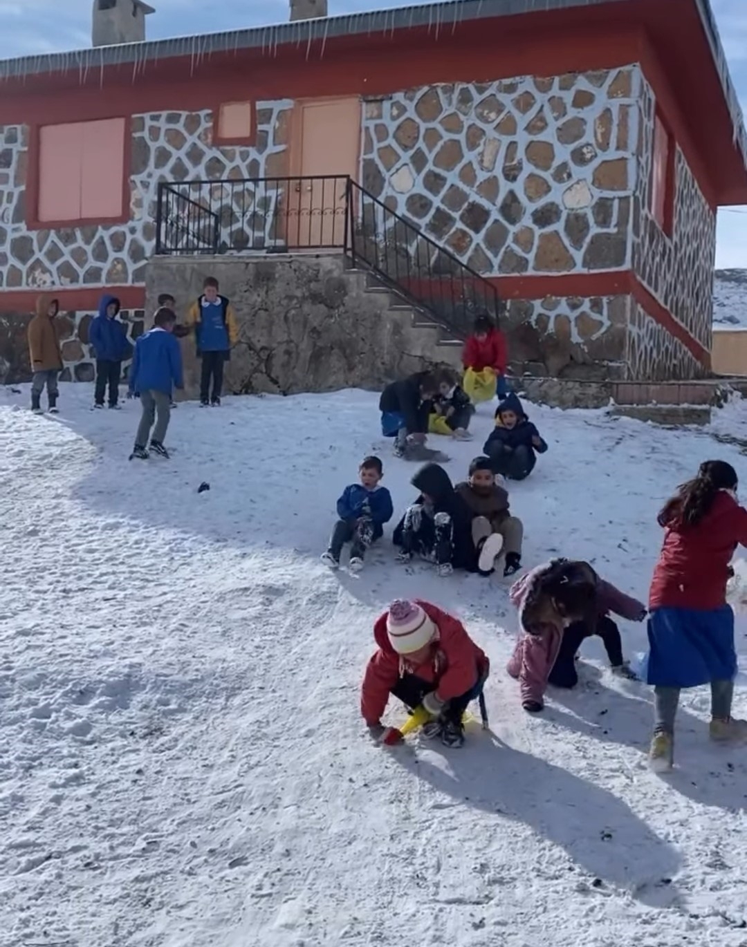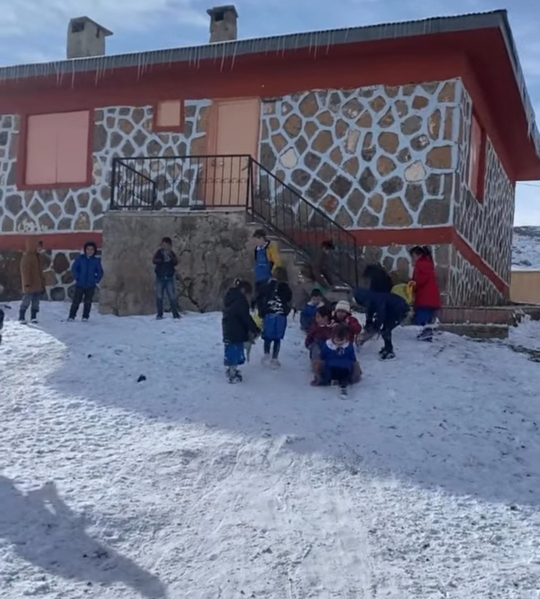 Yoğun kar yağışı nedeniyle hayat şartları zorlaşan ilçede, çocuklar karın keyfini çıkarmak için farklı yöntemler aradı. Kayak merkezlerine ulaşım imkanı bulamayan öğrenciler, ilçe merkezindeki karla kaplı yolları kayak pistine çevirdi. Pratik zekalarını kullanarak evlerinden getirdikleri naylon poşetleri kayak malzemesi olarak kullandılar.