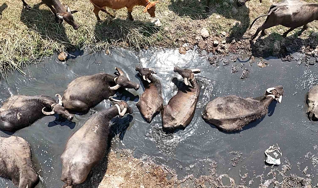 Diyarbakır'da mevsim normallerinin üzerinde seyreden hava sıcaklığı, etkisini gün geçtikçe daha da artırıyor. Silvan ilçesine bağlı kırsal Bağdere Mahallesi'nde sıcaktan bunalan mandalar, soluğu gölette alıyor. Büyükbaş hayvanlar arasında özellikle yaz mevsiminde daha fazla su ihtiyacı duyan mandalar, günde 5 saatlerini gölette geçiriyor.